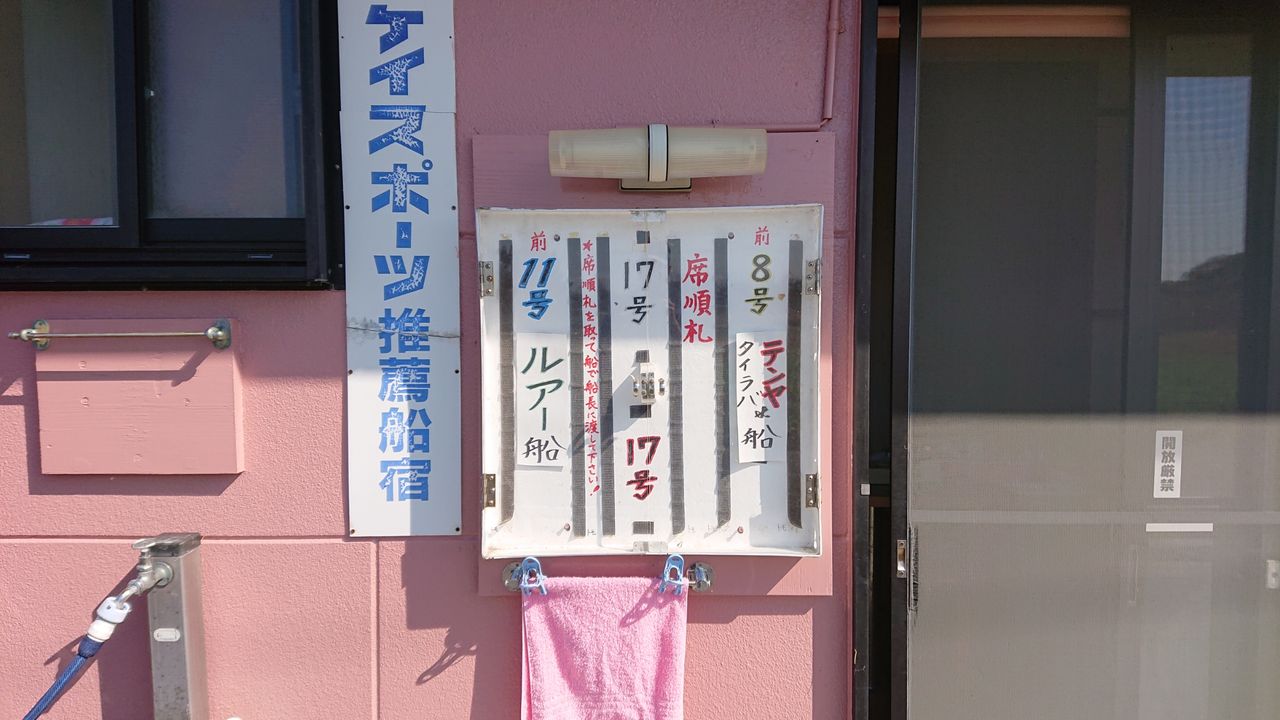 船宿の入口に釣り座の番号札があります